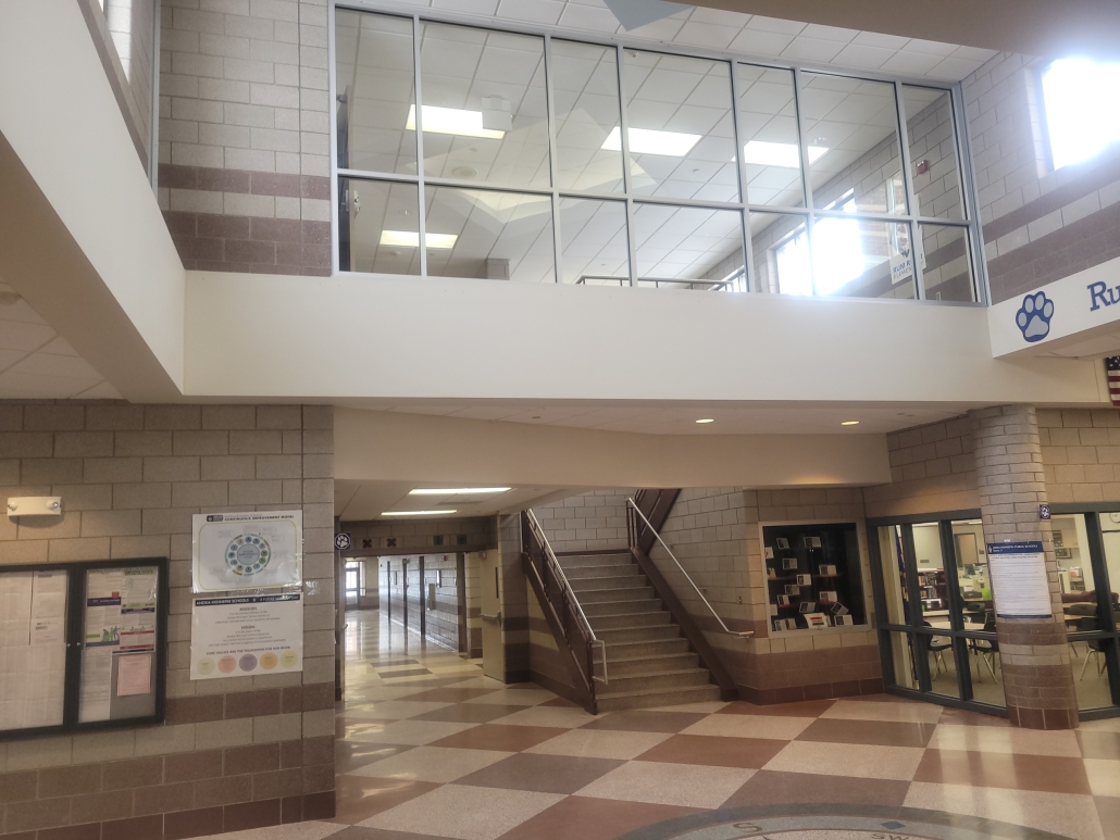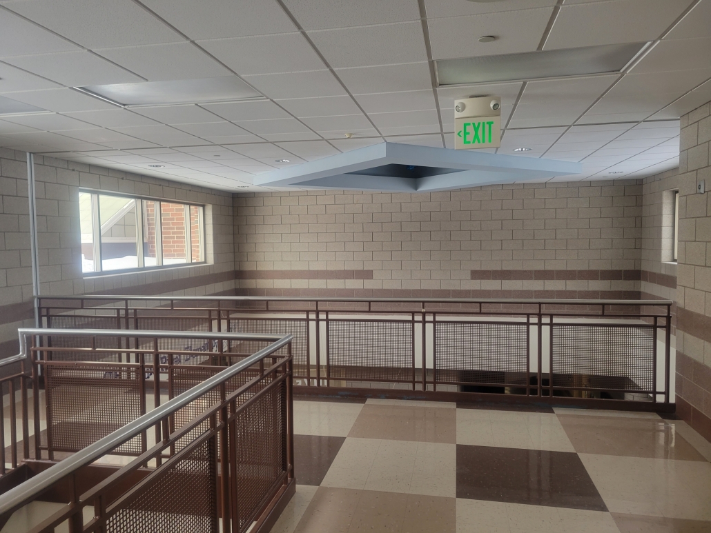 A student had climbed over the railing on the landing overlooking the foyer below. After that incident the principal wanted to close off the area with a glass wall to keep the visibility and open feeling of the space.
