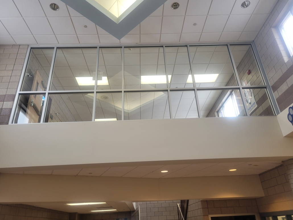We designed a storefront glass wall system that mimicked the architectural design of the existing exterior windows. We brought in another contractor to remove the steel railing and build a small knee wall for the new framing to sit on then the Brin glaziers installed the glass wall. All of this had to be completed in three days of spring break which meant we had to do everything right the first time to meet the deadline.
